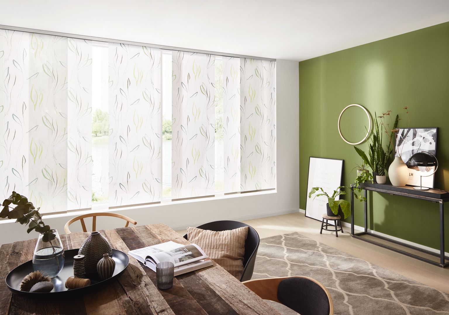 Die Paneele sind in individuellen Größen und praktisch unendlich vielen verschiedenen Stoffdesigns erhältlich. Die Paneele lassen sich einfach abnehmen und austauschen (Befestigung mittels Klettband). Die Montage der Schiebevorhänge erfolgt wahlweise an Wand oder Decke. Besonders für große Fenster, Glasfronten oder als Raumteiler bestechen Flächenvorhänge mit ihrer modernen, reduzierten Formensprache.